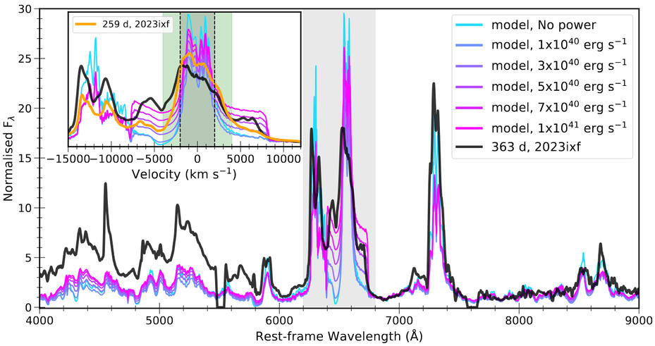 Comparison of the +363 d spectrum of SN 2023ixf with the +350 d nebular spectra models from Dessart et al. (2023). The models, representing various injected shock powers ranging from 1 × 1040 to 1 × 1041 erg s−1, are indicated in the figure legend. The inset provides a close-up view of the [O I] doublet and H𝛼 regions. For comparison, the +259 d spectrum of SN 2023ixf is also shown in the inset. The extent of the central H𝛼 component in the models (±2000 km s−1) is marked with dashed lines, while the green shaded region highlights its extent in SN 2023ixf.